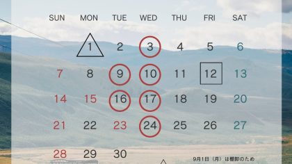 9月の定休日をご案内いたします。定休日:毎週水曜日、第2、第3火曜日また誠に勝手ではございますが、9月1日(月)は棚卸、9月12日(金)は社内研修のため下記の通り、営業時間を変更しております。9月1日(月)13時〜18時30分9月12日(金)10時〜17時30分皆さまにはご不便を...